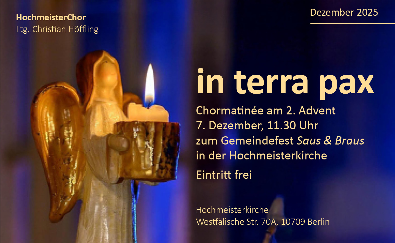 In alter Tradition wird der HochmeisterChor unter der Leitung von Christian Höffling das Gemeindefest eröffnen und uns mit Liedern aus vielen Ländern auf die Geburt Jesu einstimmen: Born is the king of Israel – Hallelujah! Das Kind, vom Himmel gesandt als Symbol der Liebe und Barmherzigkeit, wird gewärmt und in den Schlaf gewiegt, während die Menschen in seiner Umgebung vor Freude tanzen. Den Abschluss des Programms bildet Mendelssohns Neujahrslied nach J. P. Hebel, in dem wir (das Kind) um Kraft bitten für alles, was vor uns liegt: Mut … in die neuen Tage. (Quelle: Hochmeistergemeinde Halensee)